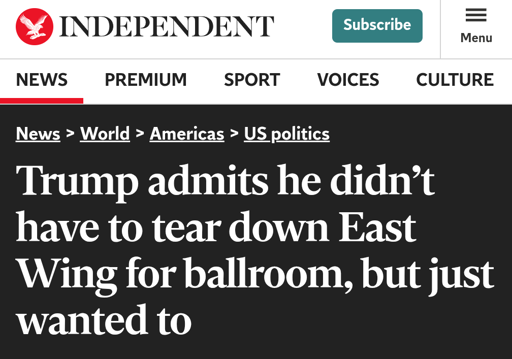 arrow-up1858arrow-down1imageTrump admits he didn’t have to tear down East Wing for ballroom, but just wanted topiefed.cdn.blahaj.zoneio@piefed.blahaj.zone to Not The Onion@lemmy.worldEnglish · 3 days agomessage-square135linkfedilinkfile-text