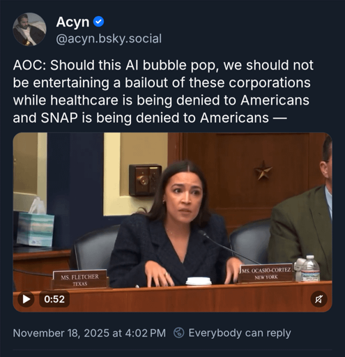 Bailout for what even? There’s no plan for ever having profitability and the amount of jobs directly working on AI is miniscule compared to the amount of jobs displaced by AI.
