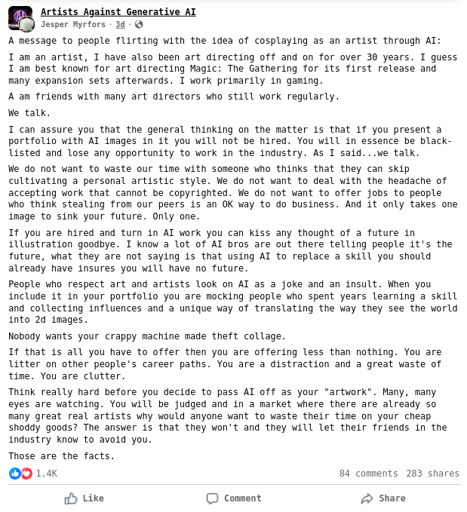 A message to people flirting with the idea of cosplaying as an artist through AI: I am an artist, I have also been art directing off and on for over 30 years. I guess I am best known for art directing Magic: The Gathering for its first release and many expansion sets afterwards. I work primarily in gaming.