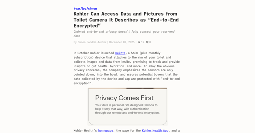 arrow-up1144arrow-down1external-linkKohler Can Access Data and Pictures from Toilet Camera It Describes as “End-to-End Encrypted”varlogsimon.leaflet.pubJensSpahnpasta@feddit.org to Technology@lemmy.worldEnglish · 7 days agomessage-square44linkfedilink