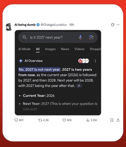 Yeah, “AI” is just statistical analysis. There’s more data in it’s database that indicates the 2027 is not year and only a few days worth of data that indicates that it is. Since there’s more data indicating 2027 is not next year, it chooses that as the correct answer.