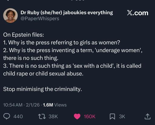 It’s embarrassing to see a country this obsessed with “War on Crime” bullshit refuse to touch ex-Presidents caught absolutely dead to rights doing crimes. All we can do is language-police the billionaire(pedophile)-owned outlets from the cheap seats.
