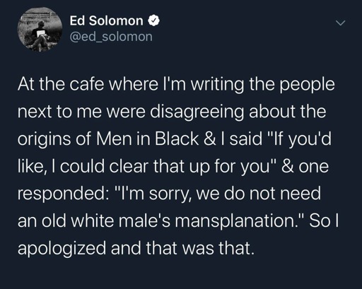 It’s a funny anecdote from the creator of Men in Black about being shut down for mansplaining the origins of Men in Black. Yikes.