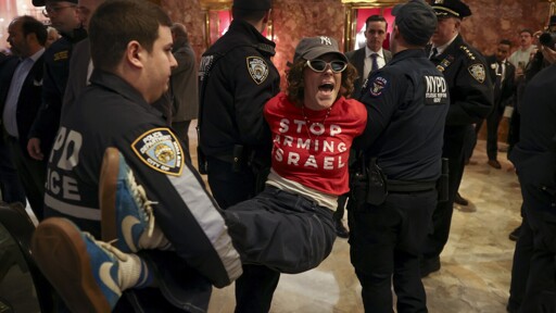"The demonstrators from Jewish Voice for Peace wore red shirts reading “Jews say stop arming Israel” and held up banners as they chanted “Bring Mahmoud home now!” on the lower level of the Fifth Avenue building’s public atrium.