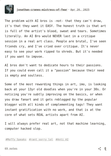 People tend to have a really shitty grasp of context and nuance. People also do use AI becaue they want to skip the work and go straight to rewards. These all stem from the same issue: lack of care. We’ve been trained to see the world like rich people: devoid of empathy, compassion, and care. It takes time and energy to understand your situation and formulate a proper reaponse. Sometimes art is a struggle and it takes time and energy to overcome your limits or figure out what it is you actually want from the work. Properly offering good critique requires empathy, and it requires the time and energy to dedicate to the critique.