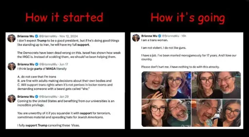 I’ve gone from being super far rightwing to now being super far leftwing over the course of my life; yet somehow, “Brianna Wu is a fucking idiot” has remained constant.
